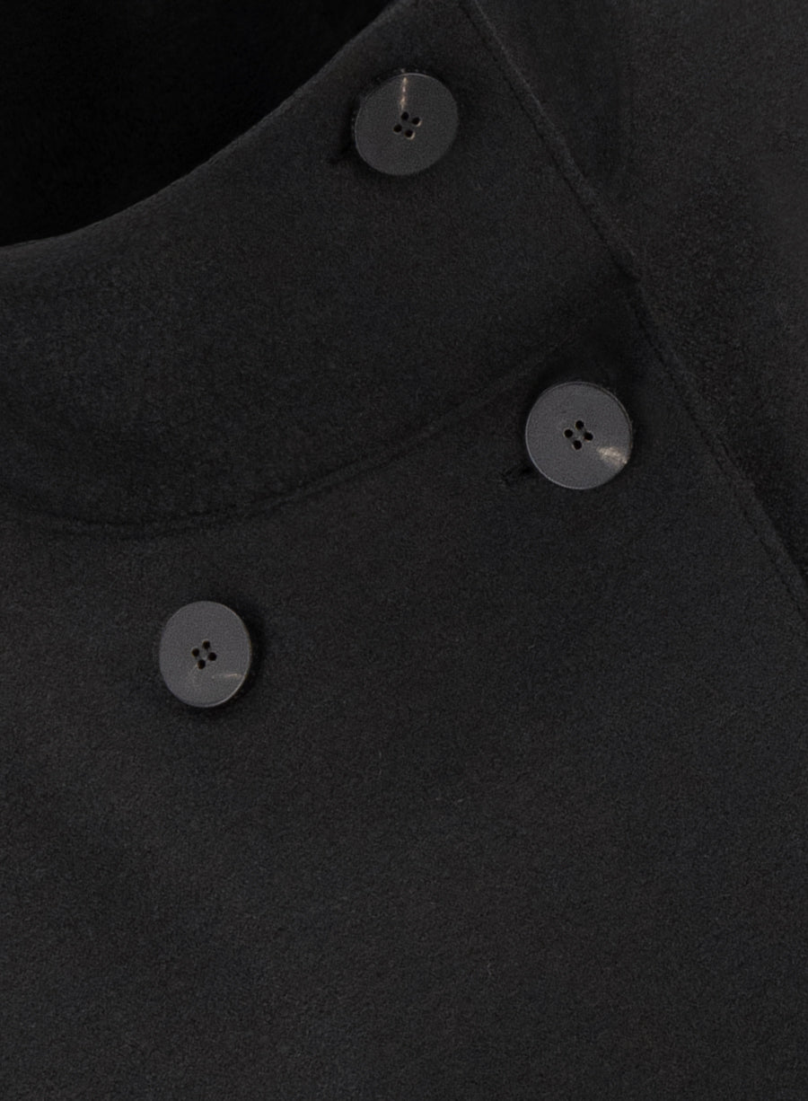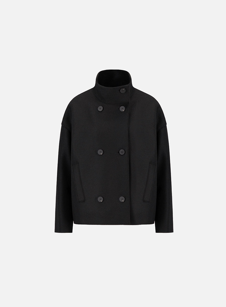 Cropped funnel collar jacket, un-lined in knitted felted wool. Short jacket with dropped raglan shoulders, long wide sleeve featuring 6-button double-breasted fastening plus 1 upper button for full closure, and welt pockets. Raw-edge finish.Made in Italy with Italian fabric.