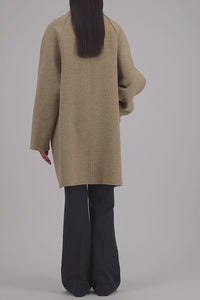Raglan cape, unlined in knitted boiled wool. Oversized cape with long sleeve featuring 2 button fastening and stnadu-up collar. Single layer garment making it lighter than our coats. Raw-edge finish.Made in Italy with Italian fabric.The model is wearing size IT 42.