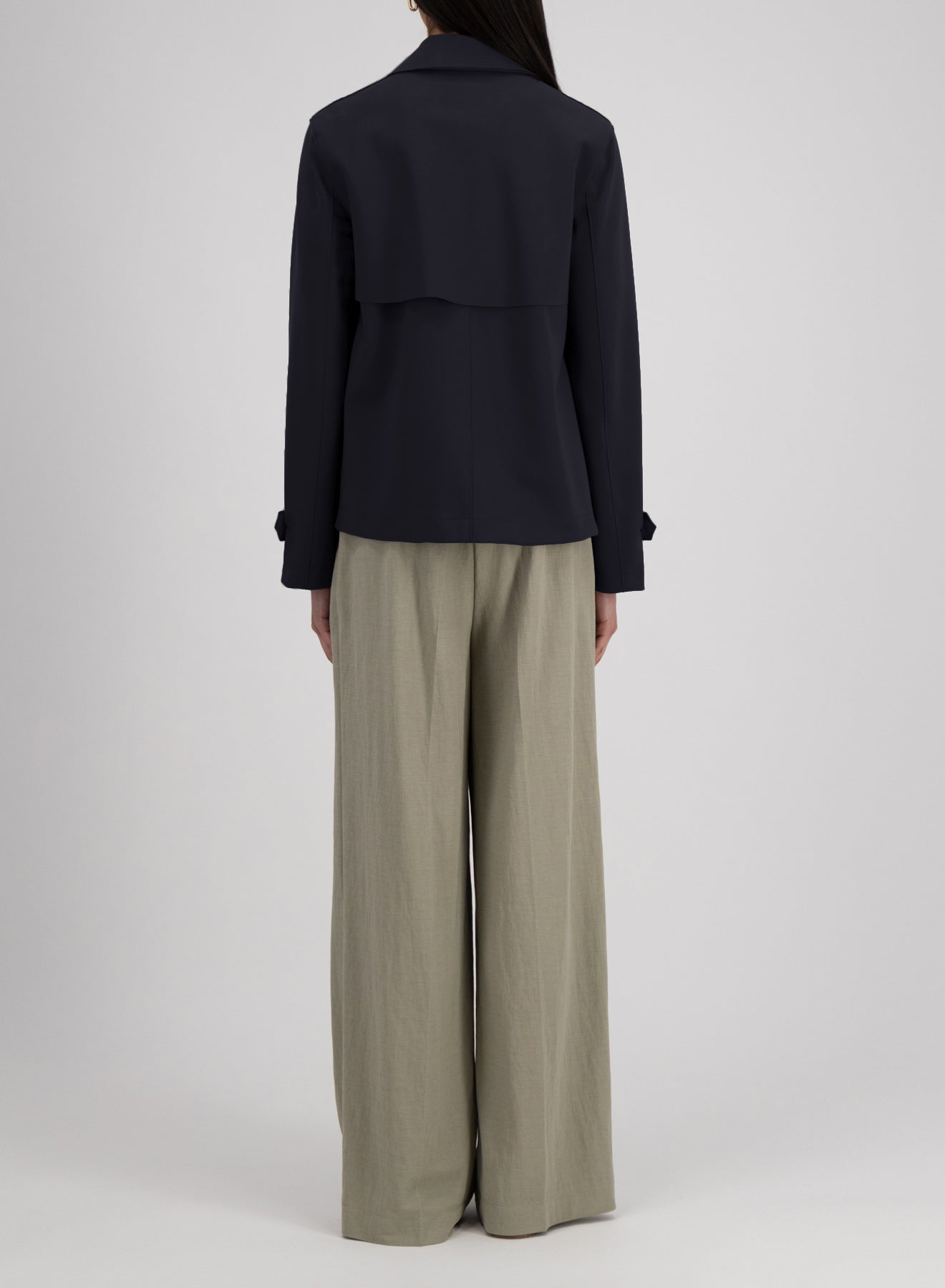 Double-breasted croped trench coat, unlined in knitted technic scuba fabric. Short jacket with long wide sleeve and double-breasted fastening featuring a notched lapel and side-seam pockets. Raw-edge finish.Made in Italy with Italian fabric.The model is wearing size IT 42.
