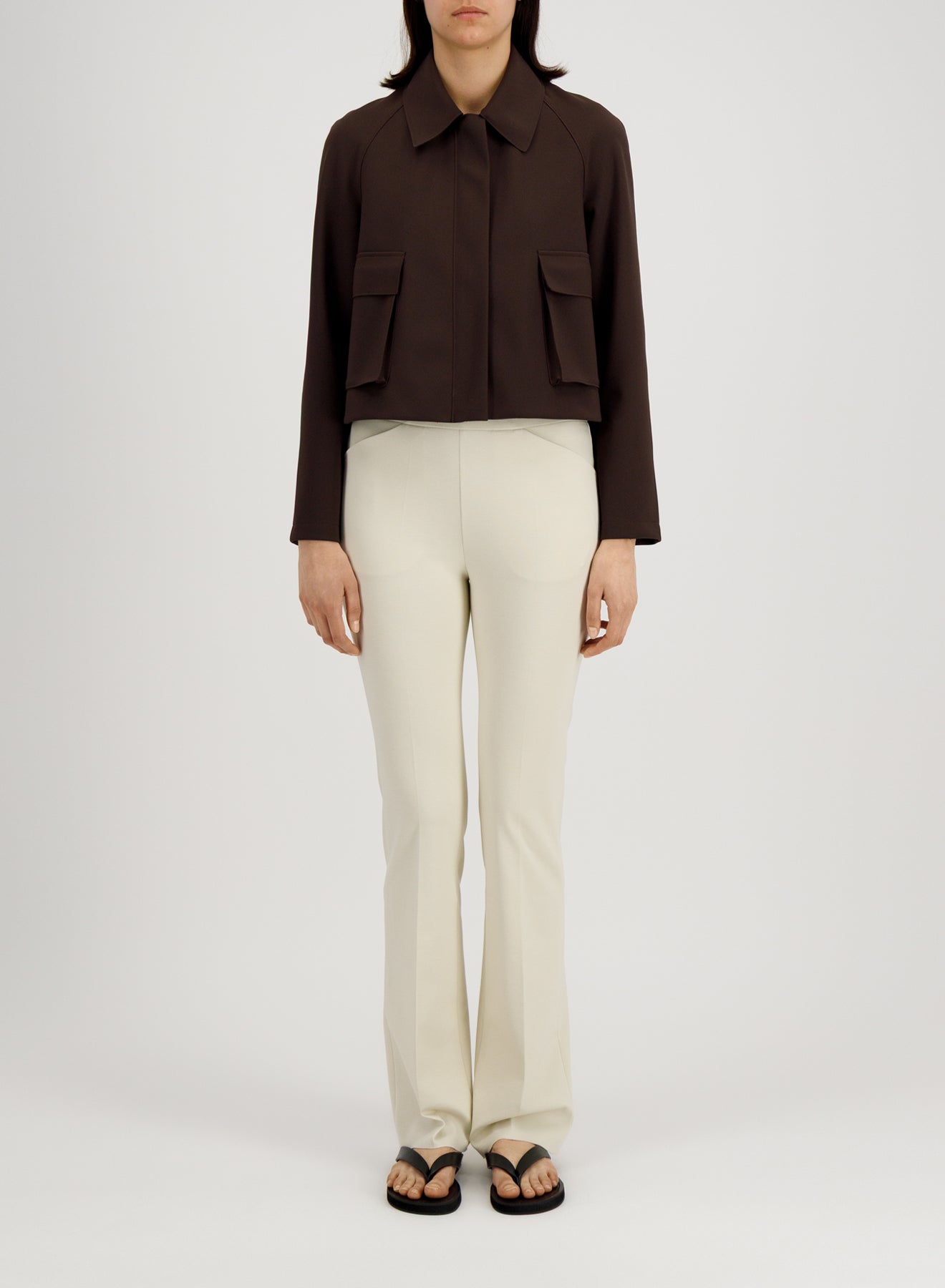 Raglan jacket, unlined in knitted technic scuba fabric. Short length A shape jacket with raglan shoulder and long sleeve featuring zip fastening and wide patch pockets with flap cover. Raw-edge finish.Made in Italy with Italian fabric.The model is wearing size IT 42.