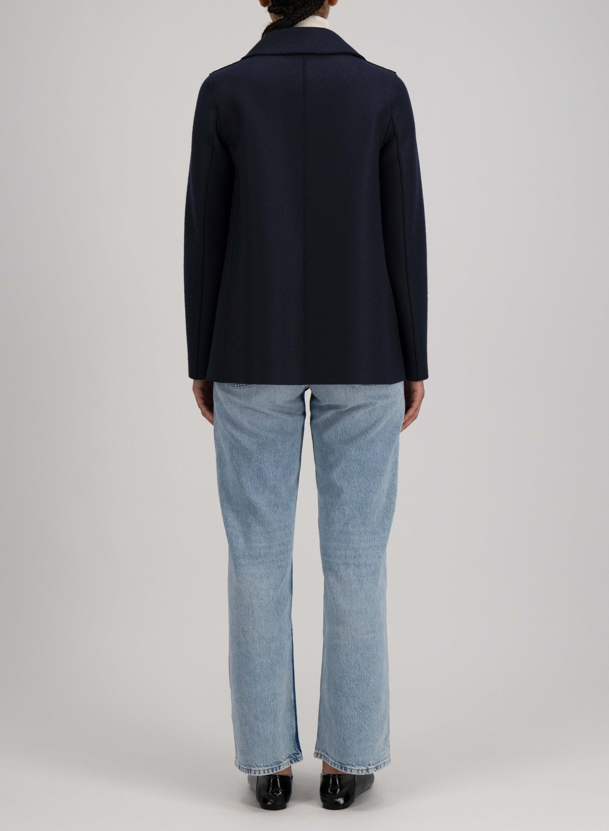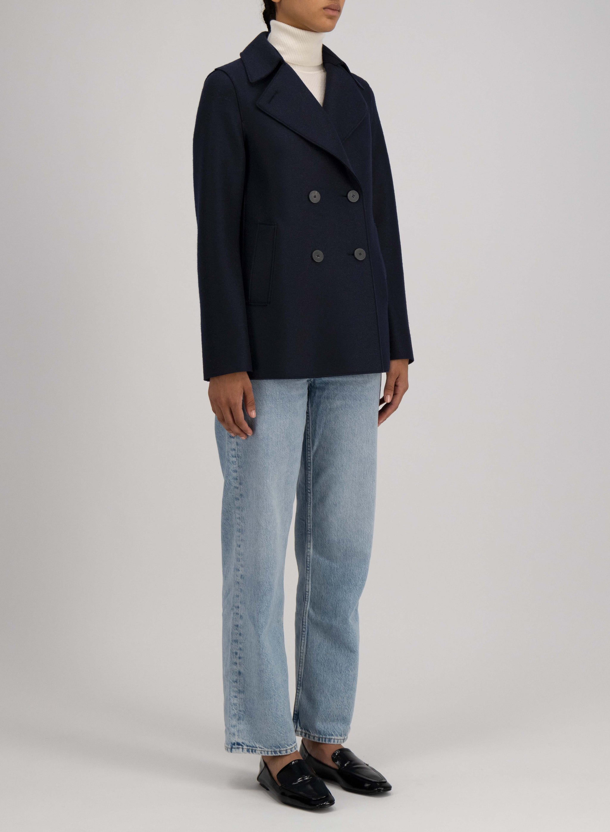Peacoat, unlined in knitted felted wool. Double-breasted short jacket, A-line shape with fitted long sleeve featuring welt pockets, classic collar shape, wide lapel and 4-button fastening. Raw-edge finish.Made in Italy with Italian fabric.The model is wearing size IT 42.